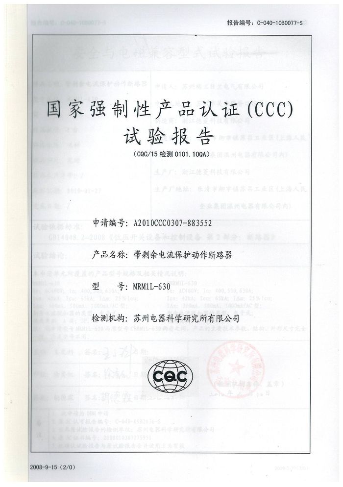 MRM1L-630塑殼漏電資質(zhì)證書