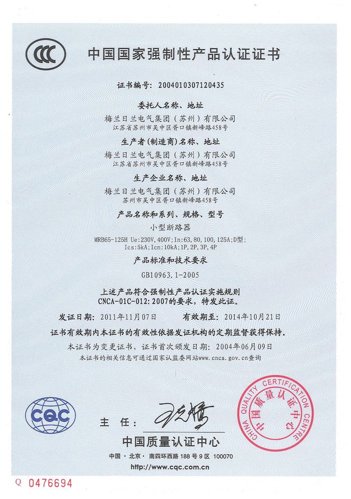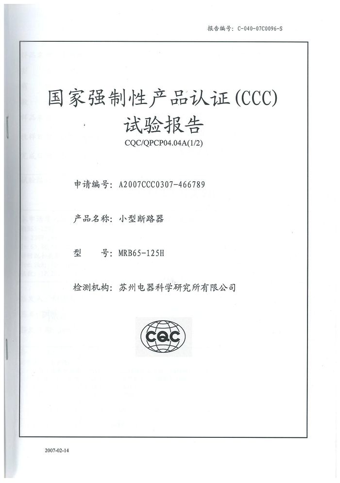 MRB65-125H小型斷路器資質證書
