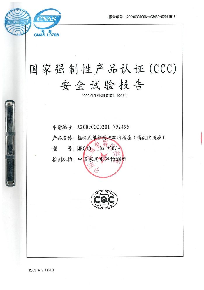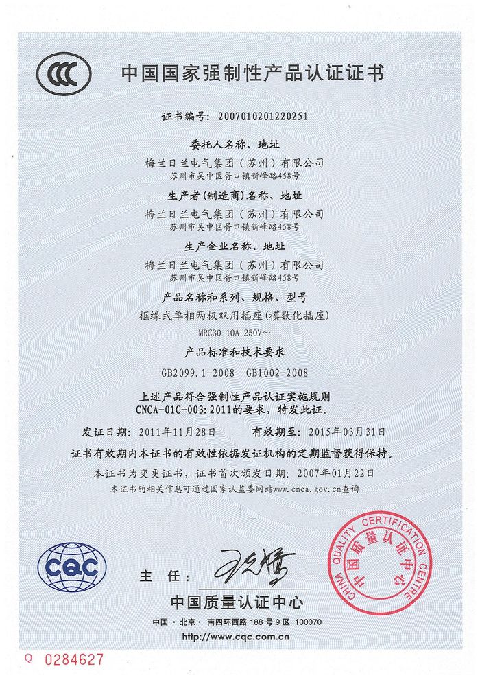 MRC30模數(shù)化插座資質(zhì)證書