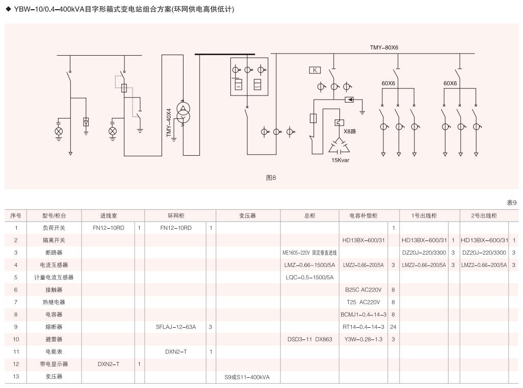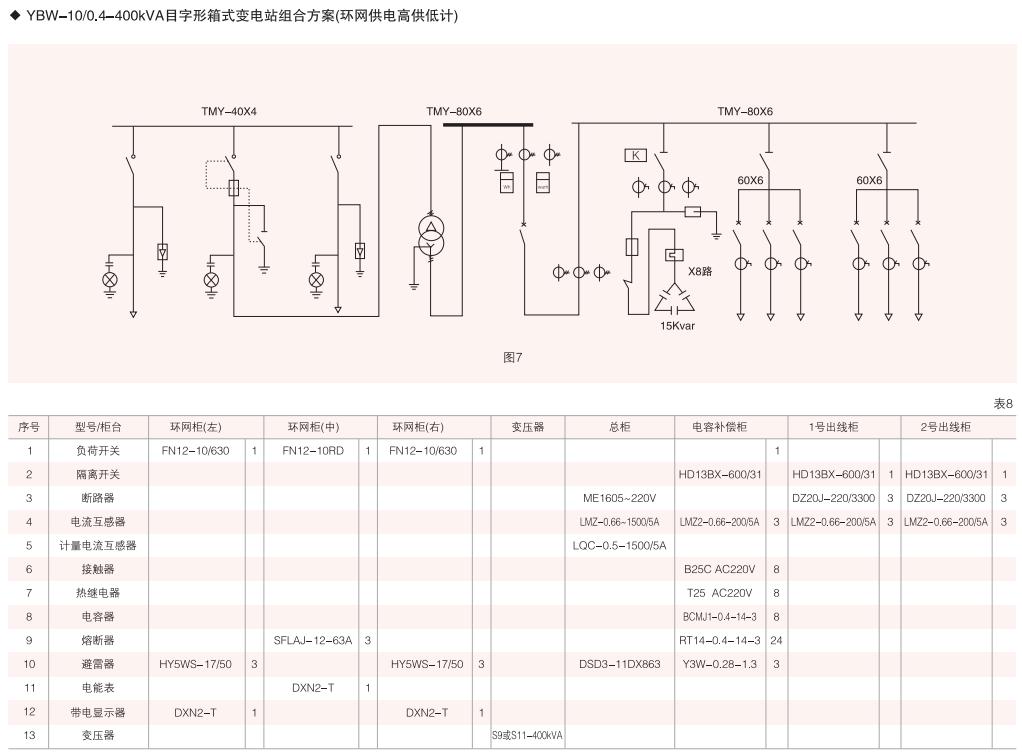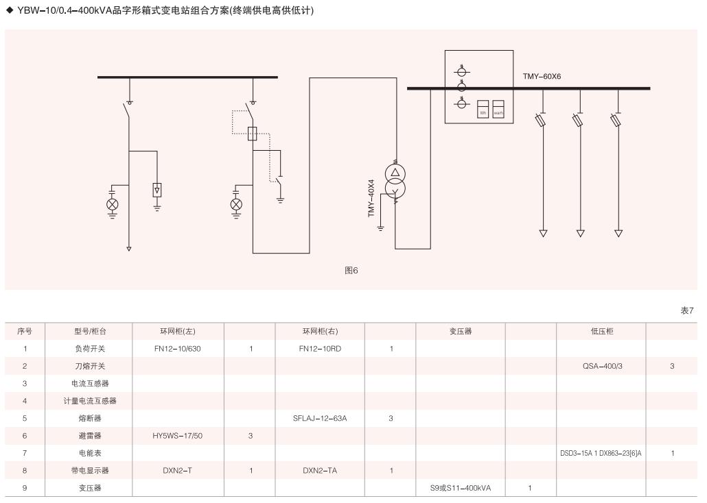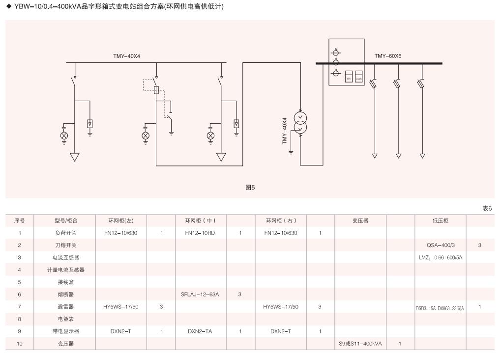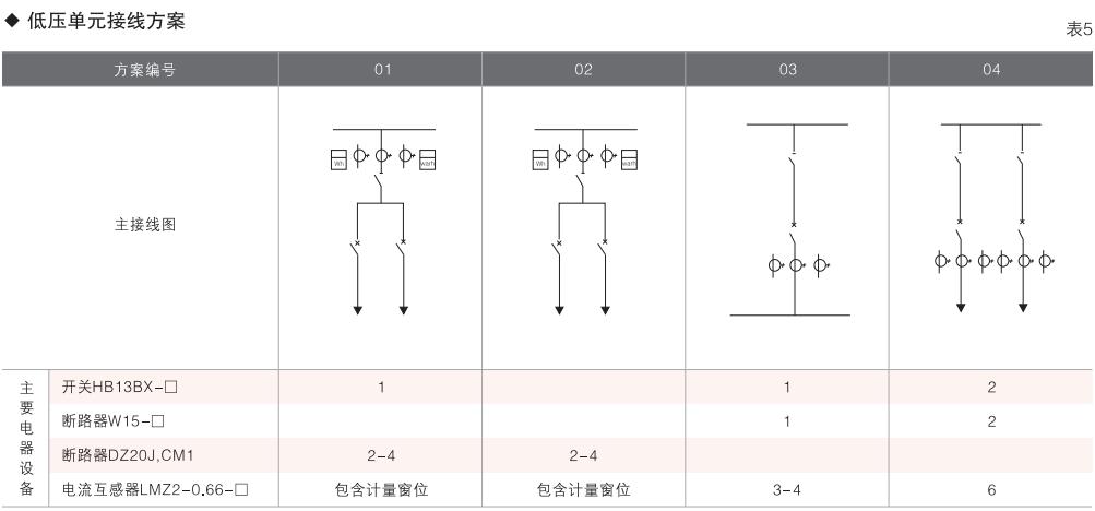 本變電箱高、低壓單元均采用組合式柜.按所需要接線組合成高、低壓配電系統(tǒng)常用高、低壓柜的接線方案均可選用,同時高壓單元又可組合成環(huán)網(wǎng)型式等。(見表4、表5)