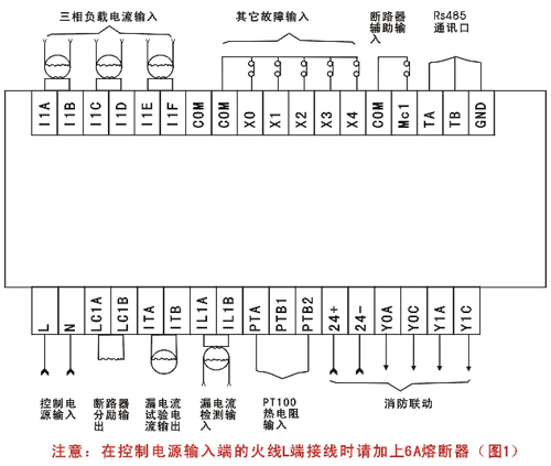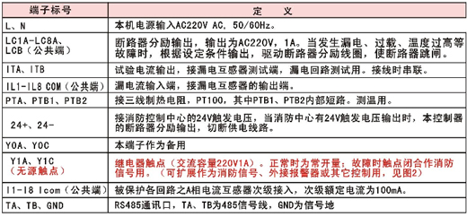 ILIA. ILIB | 漏電輸入端,接零序互感器的輸出端。 RS485通訊口,TA、TB為485信號線,GND為信號地 |