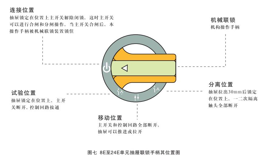 小手柄的操作及其位置定義與8E/4, 8E/2單元操作于柄基本相同,唯一沒有“斷開位置”而代之以“連接位置(↓)。只有當手柄處于此位置時,才可操作主開關操作手柄(大手柄)。大手柄指示箭頭橫向左側時為“分斷位置’,此時一次和二次電路處于無電狀態(tài),大手柄順時針轉(zhuǎn)動到指示箭頭向上時為“合閘位置”,主開關合閘。小手柄和大手柄的操作有嚴格的機械聯(lián)鎖,不能隨意操作,更不能硬扳死撬。注意:只有小手柄處在“連接位置”時,大手柄才能進行合閘操作;同時只有大手柄處在“分斷位置,時,小于柄方能轉(zhuǎn)動。有時大手柄雖也處在“分斷位置’但定位不準,這會造成小手柄不能轉(zhuǎn)動或轉(zhuǎn)動不到位,此時千萬不可硬扳,應再稍轉(zhuǎn)動大手柄使之準確到位即可。